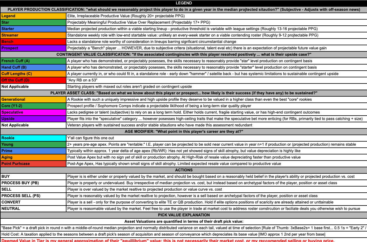 NOTE: it’s important to not take the base pick values too literally. I am ranking over 200 total players assigning a fairly arbitrary valuation standard to them. It is impossible for that to perfectly reflect my most nuanced view of every single player I ranked. Please use these valuations as a guide, and combine that with your own view of the player, your league economy, your league scoring and roster settings, and your team needs and team value to make quality transactions.