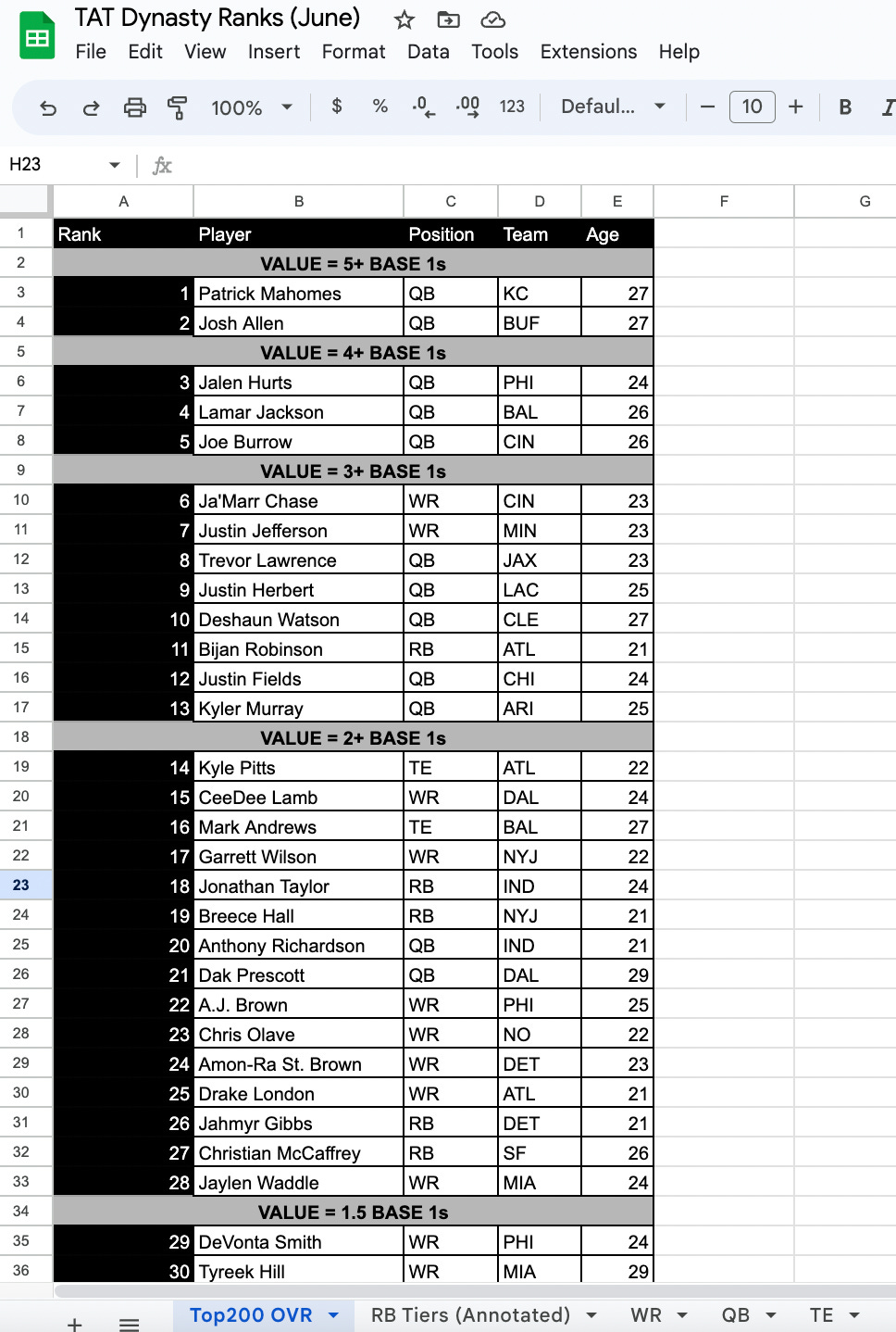 ii) At the top end, I have a high degree of latitude regarding how much an elite WR or RB is worth. I consider players like Bijan Robinson, Ja’Marr Chase and Justin Jefferson “luxury pieces” to an extent. Depending on my roster situation I may value them higher or lower than the low-end of the elite QBs.